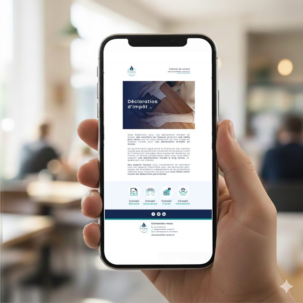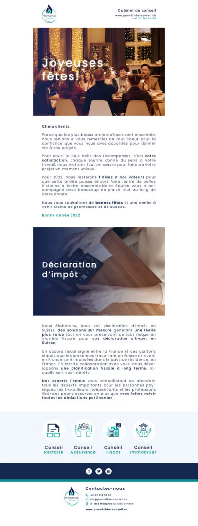 La communication digitale d’un cabinet financier ne se limite pas aux analyses techniques. Pour Prométhée Conseil, cabinet de courtage inscrit au registre FINMA, l’enjeu était de renforcer le lien de confiance avec sa clientèle à travers une newsletter de fin d’année alliant élégance, chaleur et professionnalisme.